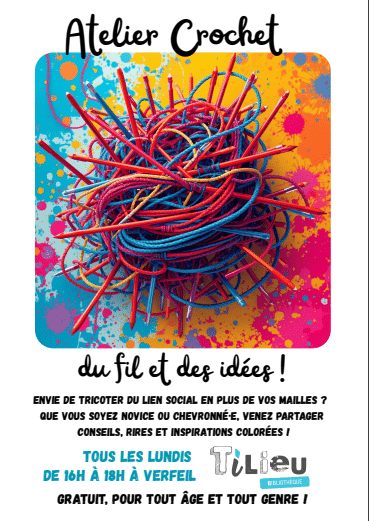 Ouvert à toutes et tous, cet atelier invite chacun·e à partager un moment convivial autour du crochet. Que vous soyez novice ou expérimenté·e, vous pourrez bénéficier de conseils, échanger, créer et laisser libre cours à votre imagination autour d’un café ou d’un thé.