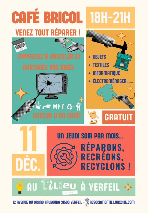 L’association TILT vous invite à participer à son Café Bricol’ : un moment convivial pour apprendre à réparer, échanger des astuces et redonner vie à vos objets du quotidien.