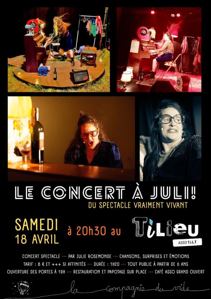 L’association T.I.L.T accueille Julie Rosemonde pour un concert-spectacle mêlant chansons, surprises et émotions.