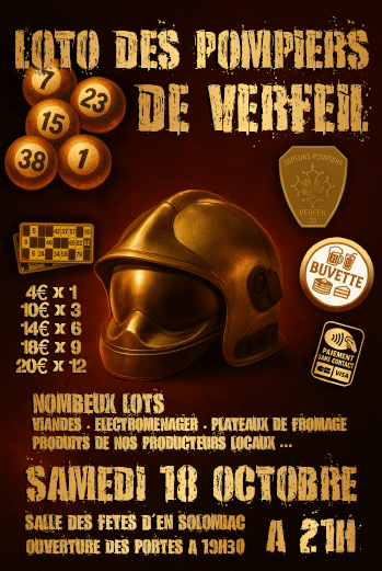 Les sapeurs-pompiers de Verfeil vous invitent à leur grand loto annuel ! Une soirée conviviale et festive vous attend, avec de nombreux lots à remporter : viandes, électroménager, plateaux de fromage et produits de nos producteurs locaux.