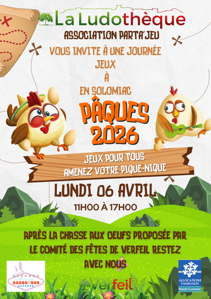 À la suite de la chasse aux œufs organisée par le comité des fêtes de Verfeil, l’association Parta’Jeu propose une journée jeux à la Ludothèque.Jeux pour tous et pique-nique à partager.