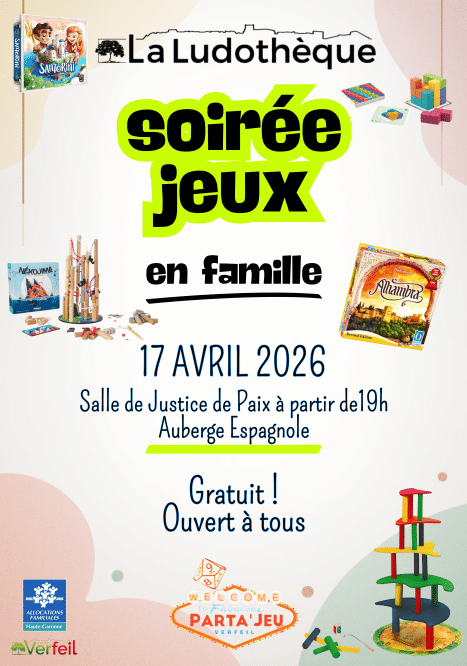 La ludothèque organise une soirée jeux en famille, gratuite et ouverte à tous.Chacun peut apporter un plat à partager pour l’auberge espagnole.